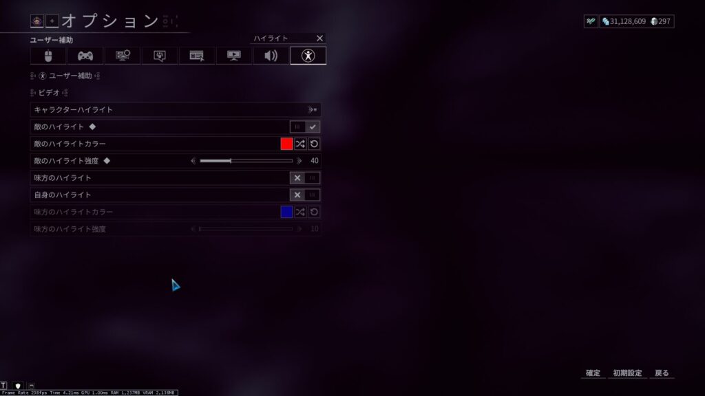 オプションから検索枠に「ハイライト」と入れ、敵のハイライトON、敵のハイライトカラー、強度を設定してください