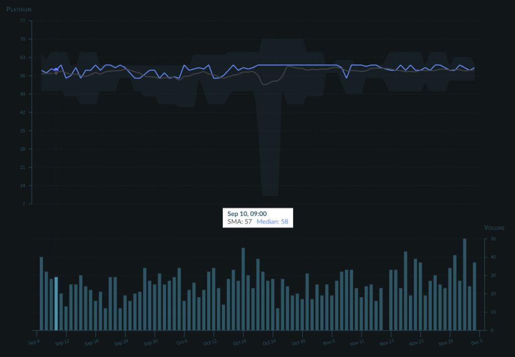1日あたりの取引件数も多く、売却レートも平均58プラチナと高めです