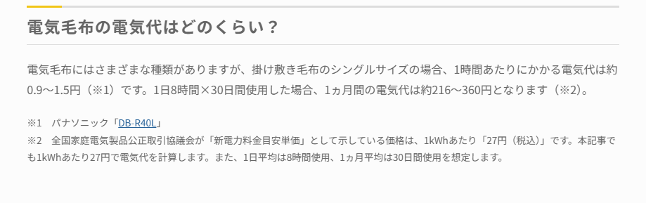 それもそのはずで、電気毛布の電気代は1時間あたり約0.9円〜1.5円(※)です